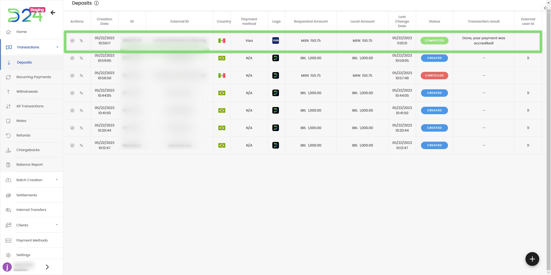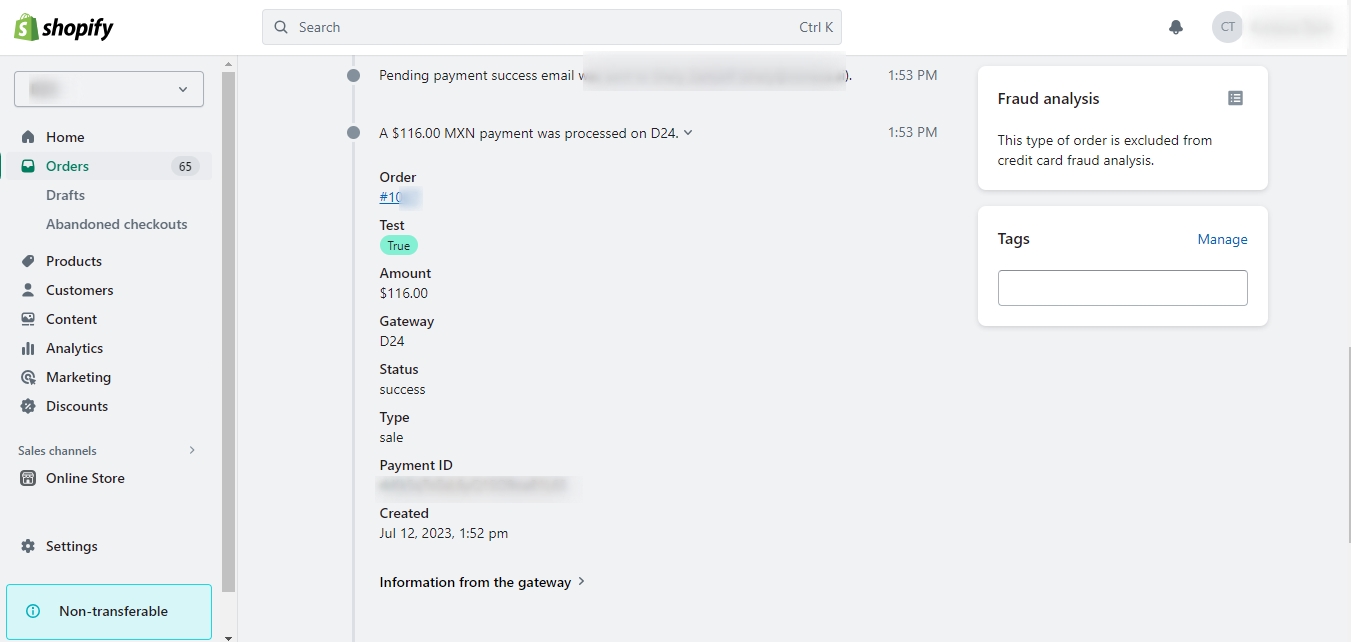 From the D24 dashboard you will be able to view the transactions made from your store, by clicking on the 'Transactions' menu you will be able to view the detail of the payment made.