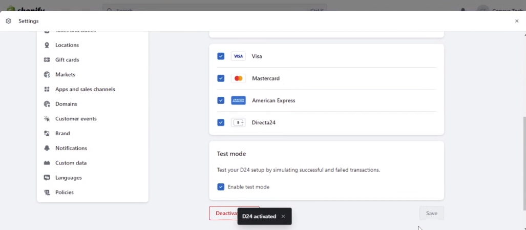 6. Once you have finished the configuration, press the 'Activate D24' button. Done! The configuration process will have finished successfully and you will be offering D24 as a means of payment to your customers.