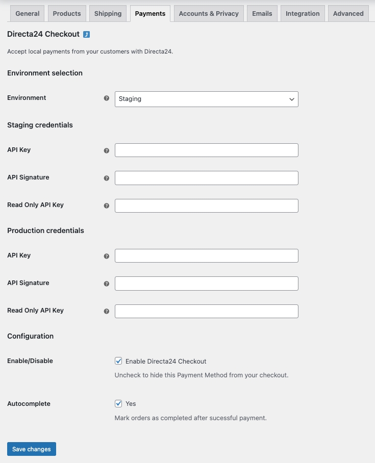 In the plugin configuration you will find four sections: Environment selection, Staging credentials, Production credentials and Configuration.